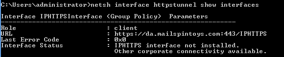 The Windows 8 client wouldn’t connect with IPHTTPS. When doing the usual troubleshooting with the netsh commands (netsh interface httpstunnel show interfaces) etc. I got the output “IPHTTPS interface not installed”.