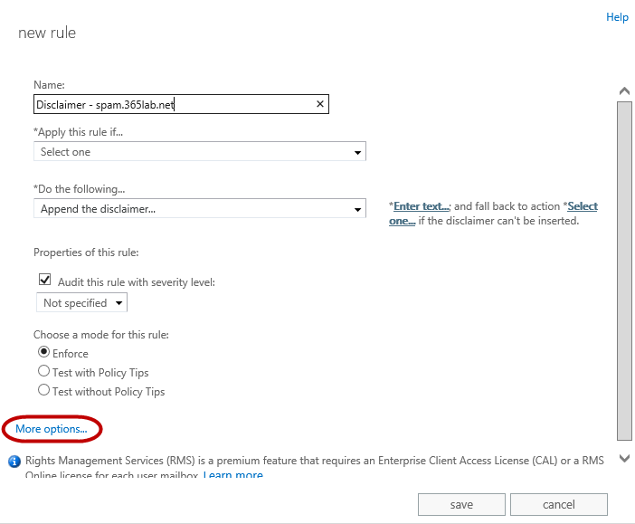 New-TransportRule -Name "Disclaimer - spam.365lab.net" `