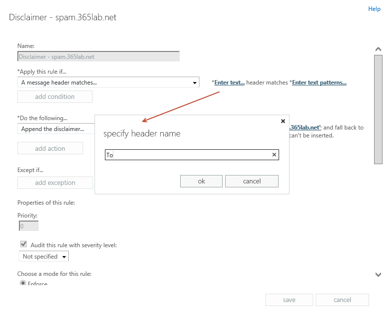 The logical thing here would have been to apply the rule if the recipient address matches my particular address, but that does only work for primary email addresses. So therefore we need to apply it on the header “To” and match the text pattern kalle.kula@spam.365lab.net (the alias address)