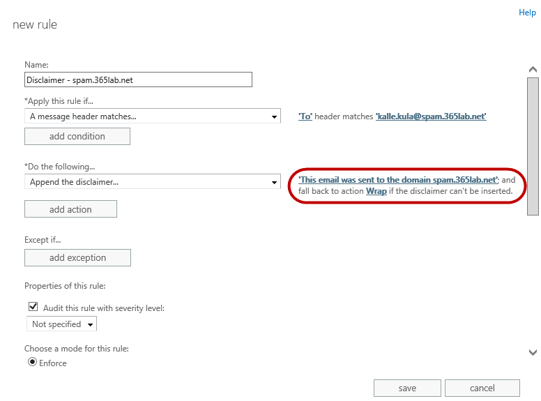If an email is sent to the address kalle.kula@spam.365lab.net (one of the alias email address for the user), we want to append a disclamer that states “This email was sent to the domain spam.365lab.net”