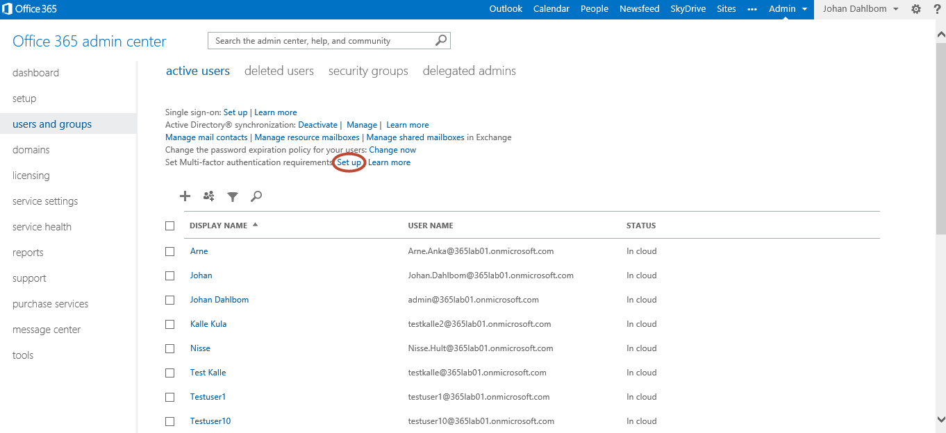 1. Logon to the O365-portal, under users and groups, find the “Set Multi-factor authentication requirements” row and click “Set up”.