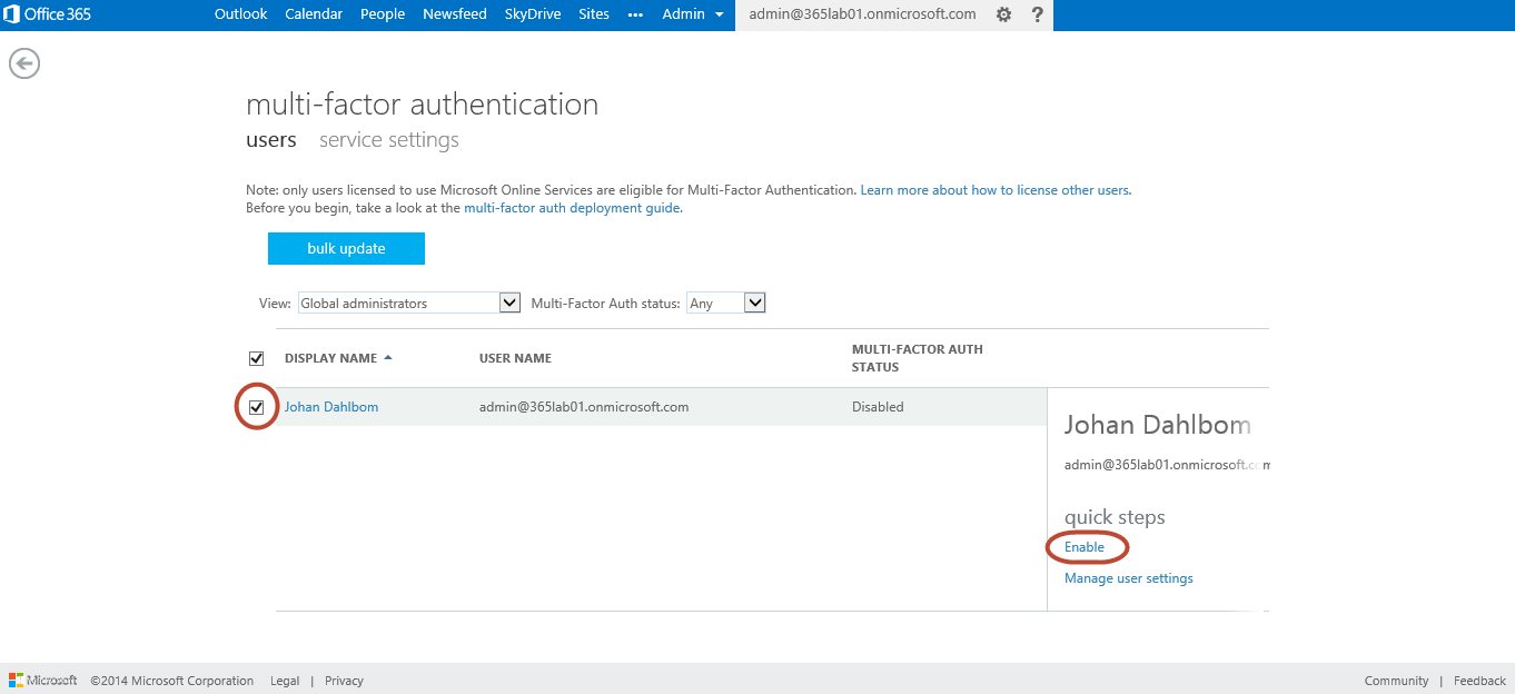 After creating eventual app passwords, you have now configured the specific account for multi factor authentication. Note that Microsoft is planning to add native multi-factor authentication for applications such as Outlook, Lync, Word, Excel, PowerPoint, PowerShell, and OneDrive for Business, with a release date planned for later in 2014.