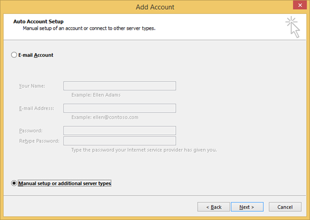 The next step is to launch the New Profile Wizard in Outlook. We will go for the option to do a Manual setup.