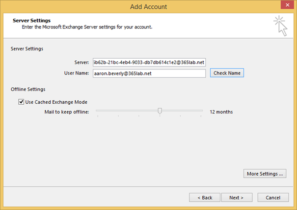The nice thing with this method is that we will be able configure Outlook without changing our Autodiscover DNS records. That means we can do a full Office 365 test deployment without affecting users in an on-premises Exchange environment.