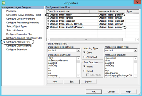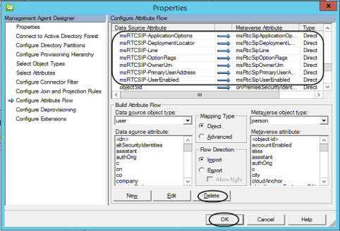 2. In the management agent designer, select “Configure attribute flow” and remove the msRTCSIP for both the User and inetOrgPerson Data Source from the attribute flow as below. Note that you can only remove one attribute at a time.
