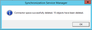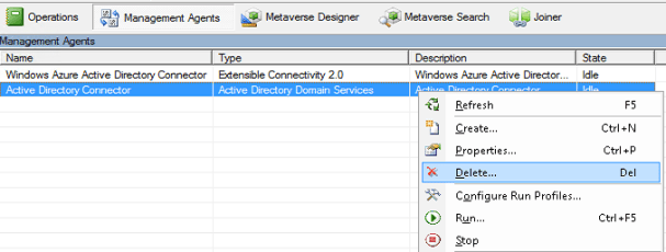 Deleting the Active Directory connector space is done with steps as below (it’s safe to click delete):