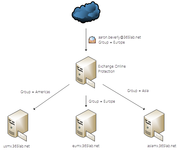 In this post we will go through how to achieve conditional mail routing in Exchange Online Protection, without the need of having forwarding addresses per user. This means we can deliver incoming emails sent to the same domain to different back end servers, based on other criterias than forwarding addresses, like certain attributes or group membership.