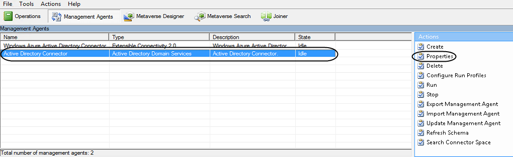 Start the Synchronization Service Manager (miisclient.exe) on the DirSync server. In the “Management agents” pane, select properties on the Active Directory connector.