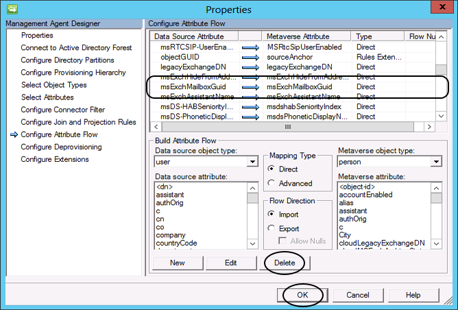 In the management agent designer, select “Configure attribute flow” and remove the msExchMailboxGuid for both the User and inetOrgPerson Data Source from the attribute flow as below.