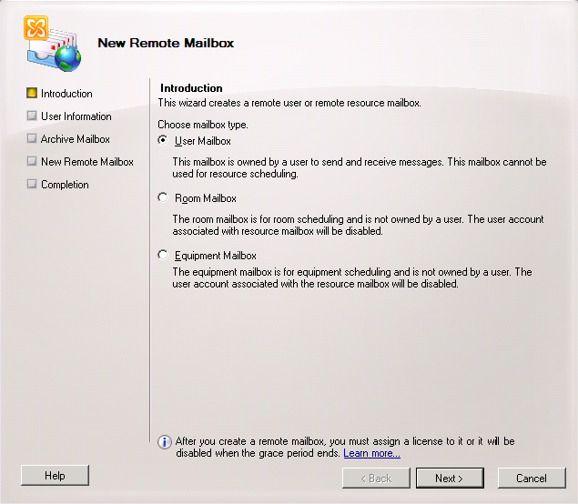 Select the type of mailbox you are creating, normally a User Mailbox.