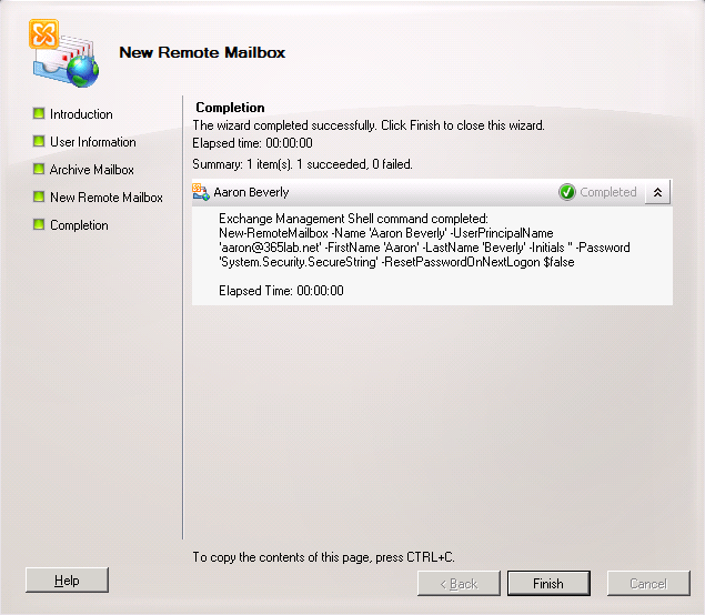 This means that we are all set, our on-premises Exchange server is now aware of the Mailbox in Office 365! The final step is to wait for DirSync (or force a sync) then assign a license to the user.