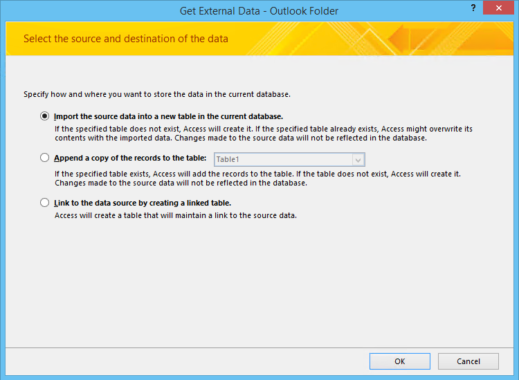 On the External Data tab select Outlook Folder