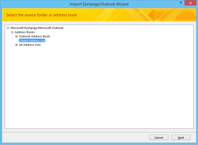 Now select the address list to export from, in this case I select the Global Address List to get all addresses.