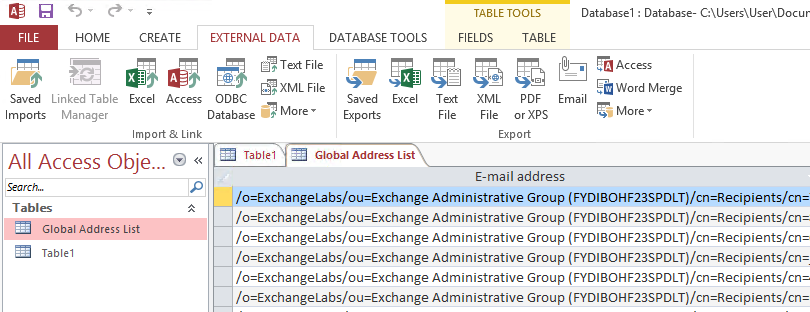 Now we’re done! A new table has been added to the database, and in the E-mail address column you will see the legacyExchangeDN for all users