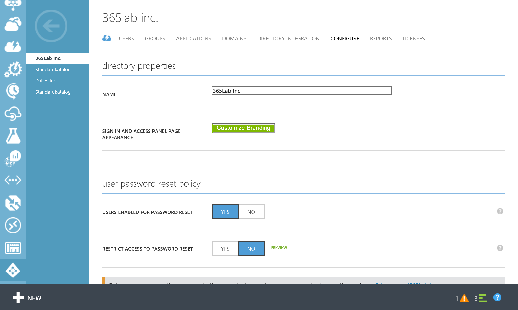 After assigning Azure AD Premium Licenses to the Admin account, you will now see all the AADP-features, including Sign in branding and password reset under the configure pane, just as below.