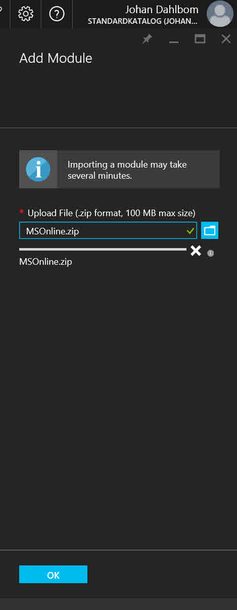 1. Since the MSOnline module is not included by default in Azure Automation you need to download and install the module on your computer. When that is done you need to add the module folders (MSOnline and MSOnlineExtended) to a zip file each. The easiest way to do that is of course with PowerShell 🙂