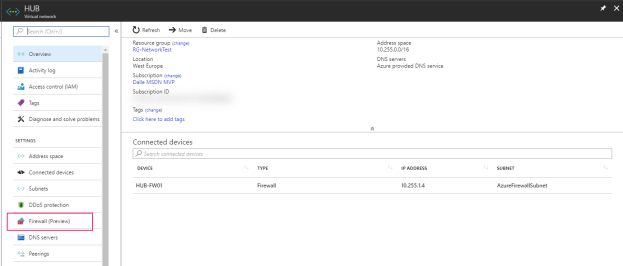 In my test I have chosen to deploy the firewall into the hub in a standard hub and spoke network topology, which I think will be the most common way to deploy the firewall.
