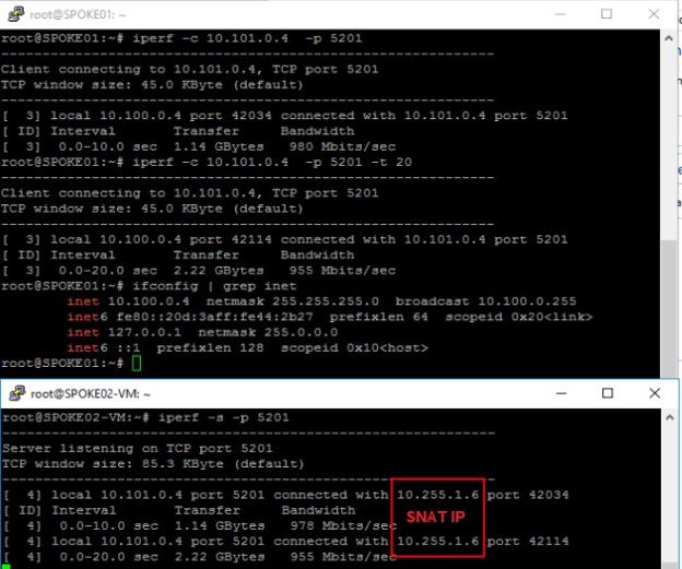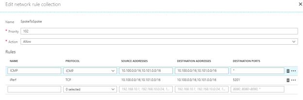 Another common scenario commonly handled by an NVA is spoke two spoke traffic. Obviously it is also possible to solve this with VNet peering, but by routing the traffic through the hub we get a much better and more granular control. To try out this scenario I created an additional rule collection allowing ICMP and TCP 5201 (iPerf) between the subnets and it worked well. It is still doing SNAT and not routing so the connections will come from the firewall and not from the true source ip. I could also see that the connections sometimes came from different ip’s (different load balanced firewall nodes).