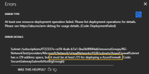 • The firewall needs one dedicated subnet, minimum /25 . It is a fairly large subnet, but suppose it’s because it needs address space to scale out without any restrictions. It isn’t very clear in the documentation and it will not complain about this until you actually deploy the firewall. The subnet must be named AzureFirewallSubnet.