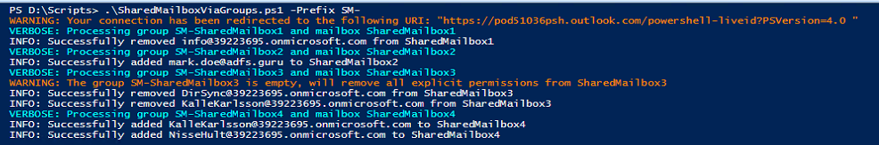 As seen in the screenshot above it will process adds and removals of permissions for all mailboxes/groups in scope. Please note that both FullAccess and SendAs-permissions are added for each delegate.